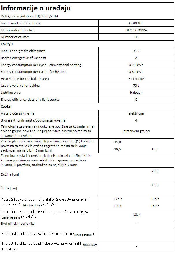 | Površina za kuvanje | - Zona kuvanja napred levo Dupli prosirivi Highlight grejač- Ø napred levo (mm) 180/120- Snaga zone za kuvanje napred levo 700 W- 2. snaga zone za kuvanje napred levo 1700 W- Snaga zone za kuvanje napred desno Brzi highlight grejač- Ø napred desno (mm) 145- Snaga zone za kuvanje napred desno 1200 W- Zona za kuvanje nazad levo Brzi highlight grejač- Ø levo iza (mm) 145- Snaga zone za kuvanje nazad levo 2000 W- Zone za kuvanje nazad desno Ovalni highlight grejač- Ø desno iza (mm) 140X250- Snaga zone za kuvanje nazad desno 1100 W- 2. snaga zone za kuvanje nazad desno 2000 W |