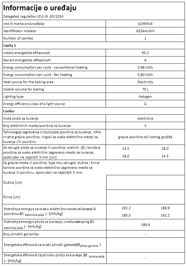 | Površina za kuvanje | - Zona kuvanja napred levo Ekspres električna ringla- Ø napred levo (mm) 180- Snaga zone za kuvanje napred levo 2000 W- Snaga zone za kuvanje napred desno Standard hotplate- Ø napred desno (mm) 145- Snaga zone za kuvanje napred desno 1000 W- Zona za kuvanje nazad levo Standard hotplate- Ø levo iza (mm) 145- Snaga zone za kuvanje nazad levo 1000 W- Zone za kuvanje nazad desno Standardna električna ploča sa temperaturnim ograničavačem- Ø desno iza (mm) 180- Snaga zone za kuvanje nazad desno 1500 W |