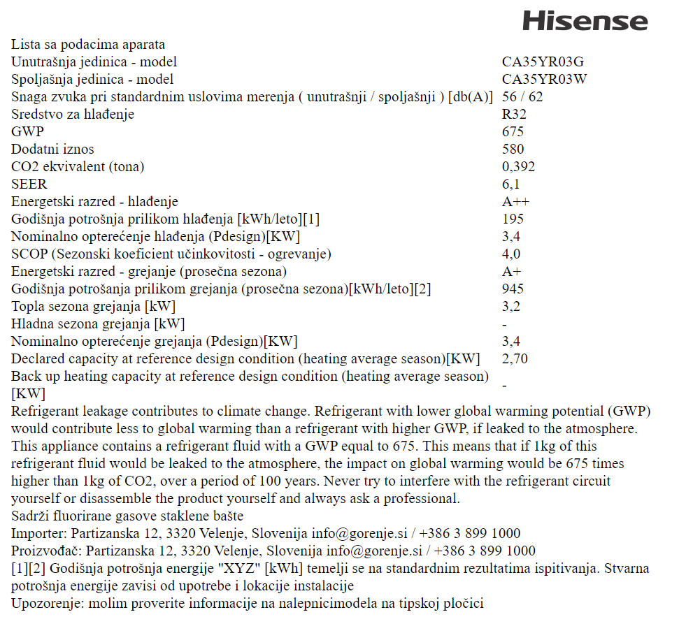 - Godišnja potrošnja električne energije u režimu hlađenje (QCE):195 kWh