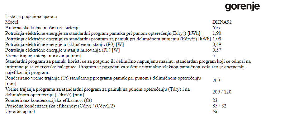Gorenje DHNA92 Mašina za sušenje veša, kondezaciona, sa toplotnom pumpom, 9 kg