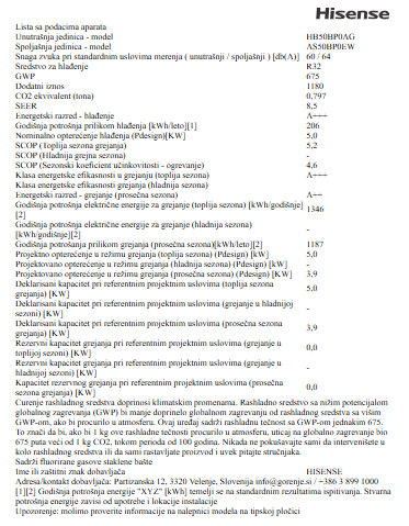 • Godišnja potrošnja električne energije u režimu hlađenje (QCE): 206 kWh