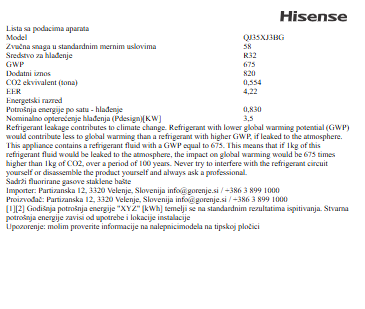 - Godišnja potrošnja električne energije u režimu hlađenje (QCE): 144 kWh